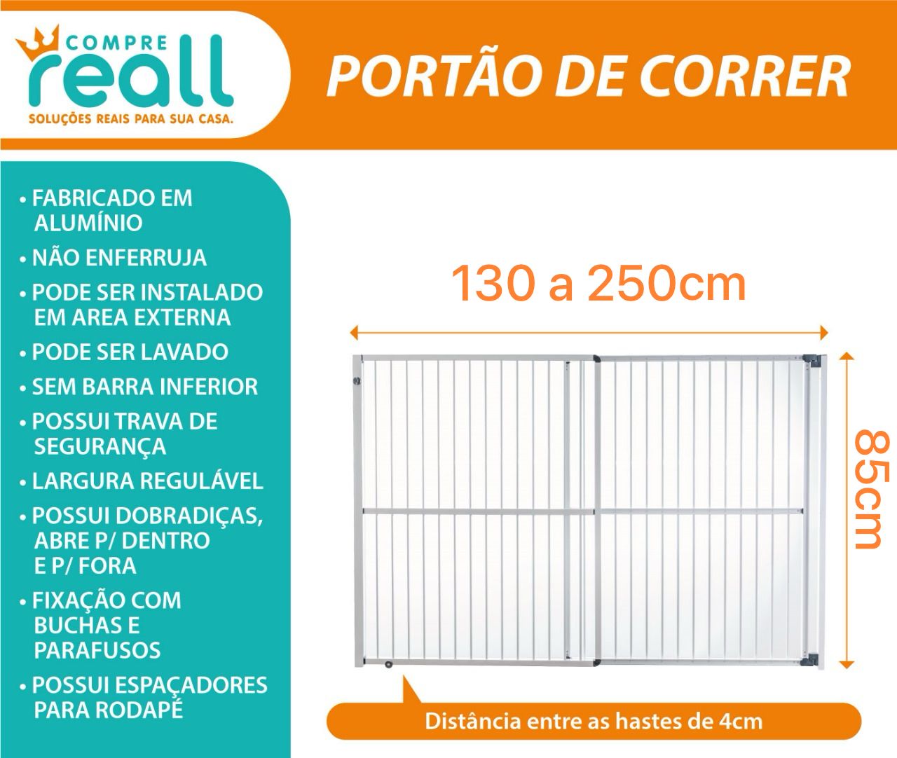 COMPREREALL é uma marca brasileira dedicada a desenvolver soluções de segurança para famílias, com foco em produtos práticos e de alta qualidade para proteção de crianças e pets. Especializada em portões de alumínio com design exclusivo, a COMPREREALL une funcionalidade e estética, oferecendo portões que aliam segurança, durabilidade e beleza. Nossos produtos são fabricados com materiais resistentes, com pintura epóxi, e são ideais tanto para ambientes internos quanto externos, que não enferrujam.
